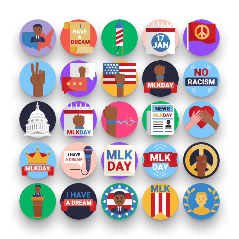 This premium set of 50 Martin Luther King icons is designed to honor the legacy of justice, equality, and nonviolent activism. Inspired by themes connected to the civil rights movement, this collection is ideal for designers and educators looking to create meaningful visual content.