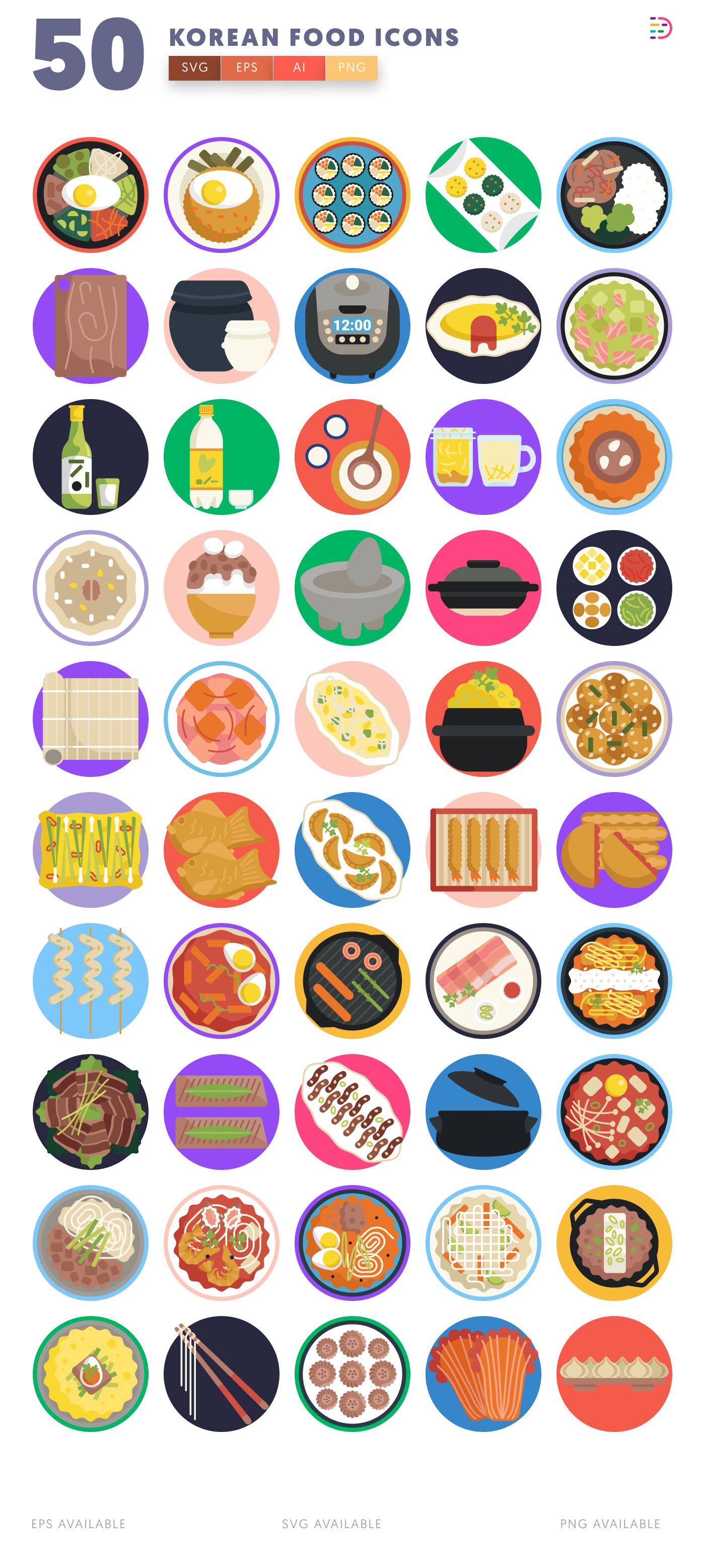 This carefully designed icon pack includes popular Korean dishes and ingredients such as kimchi, bibimbap, ramen, tteokbokki, sushi-style kimbap, Korean BBQ, dumplings, soju, and more.