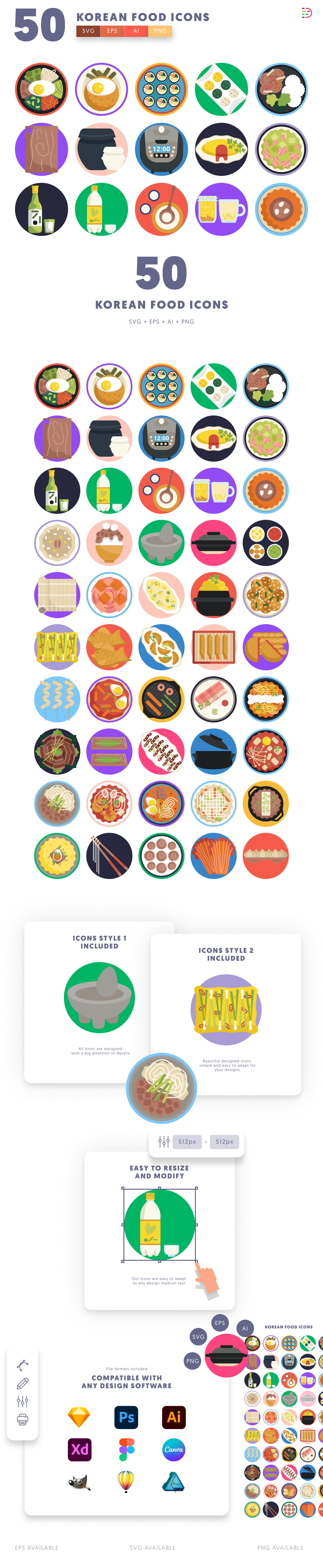 Bring authentic Korean cuisine into your design projects with this beautifully crafted 50 Korean Food Icons set. Perfect for UI/UX designers, branding projects, restaurant menus, food apps, packaging, websites, and social media content.