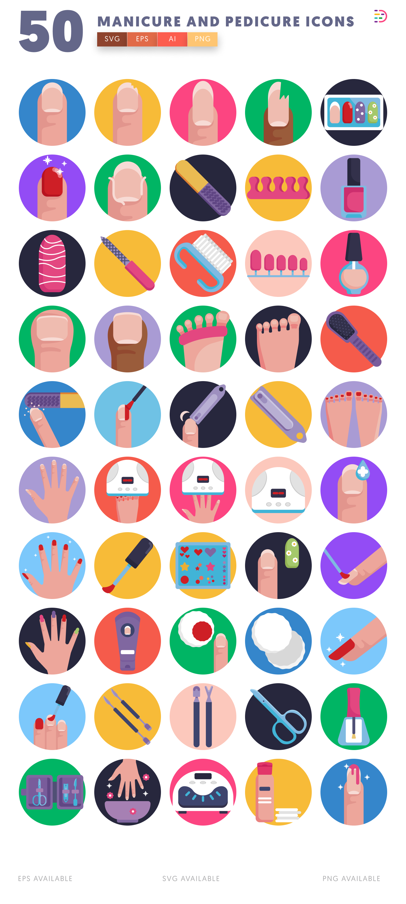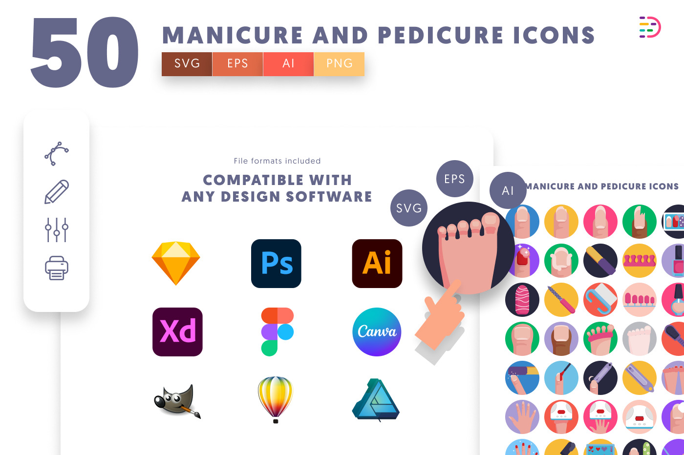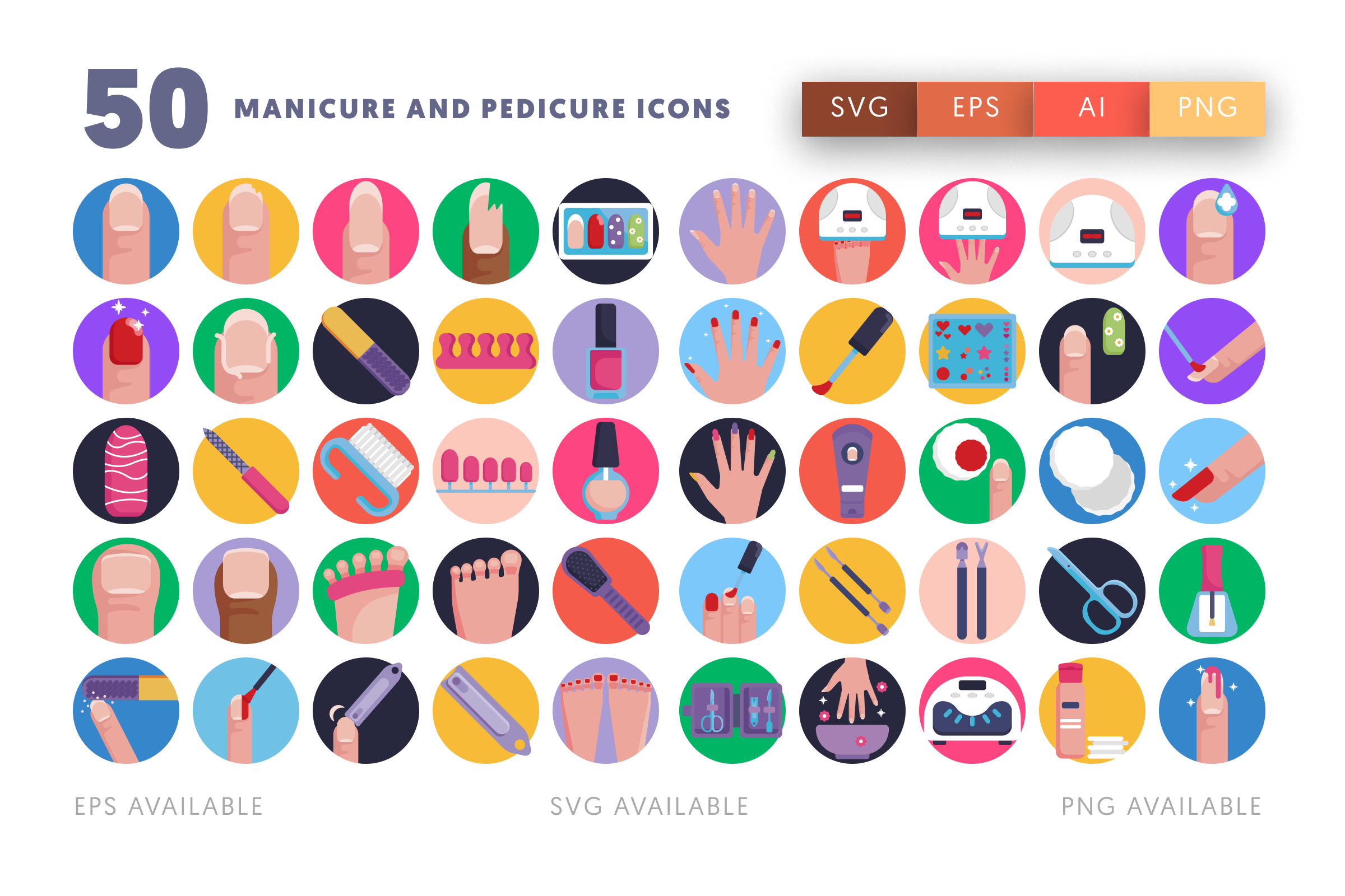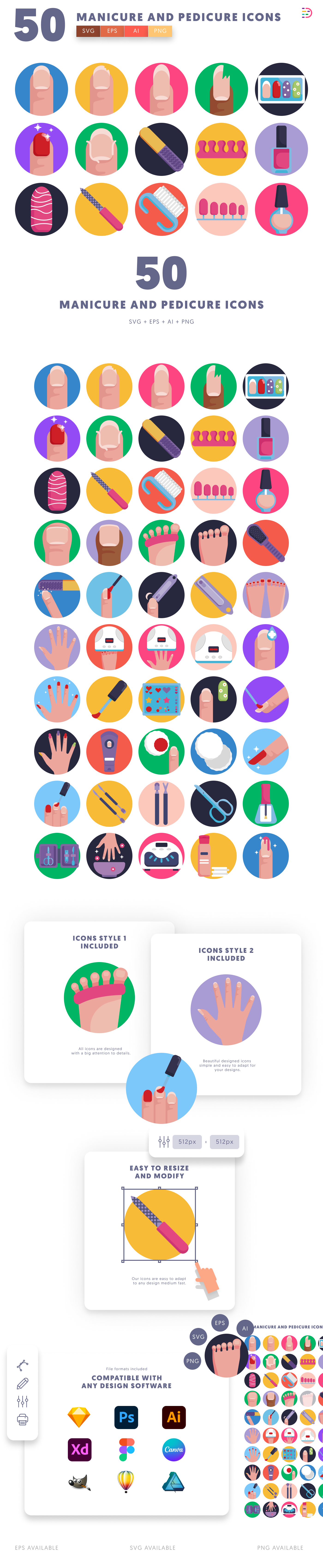Elevate your beauty and nail care projects with the 50-Manicure and Pedicure Icons set. This versatile collection features sleek, modern icons representing nail polish, nail tools, foot care, and spa treatments. Perfect for websites, apps, social media, and print designs, these icons will help you create visually appealing content that attracts attention and enhances your brand. Ideal for beauty salons, nail artists, and wellness professionals looking to add a professional touch to their projects.