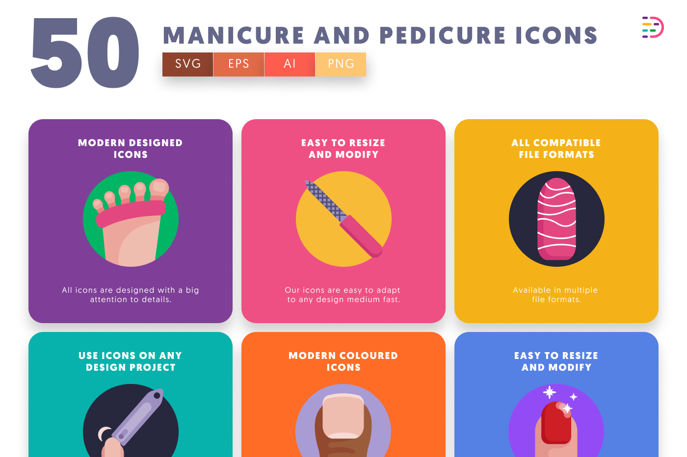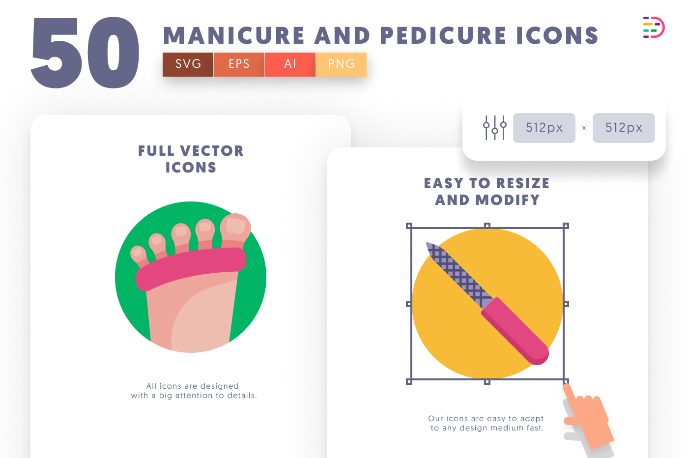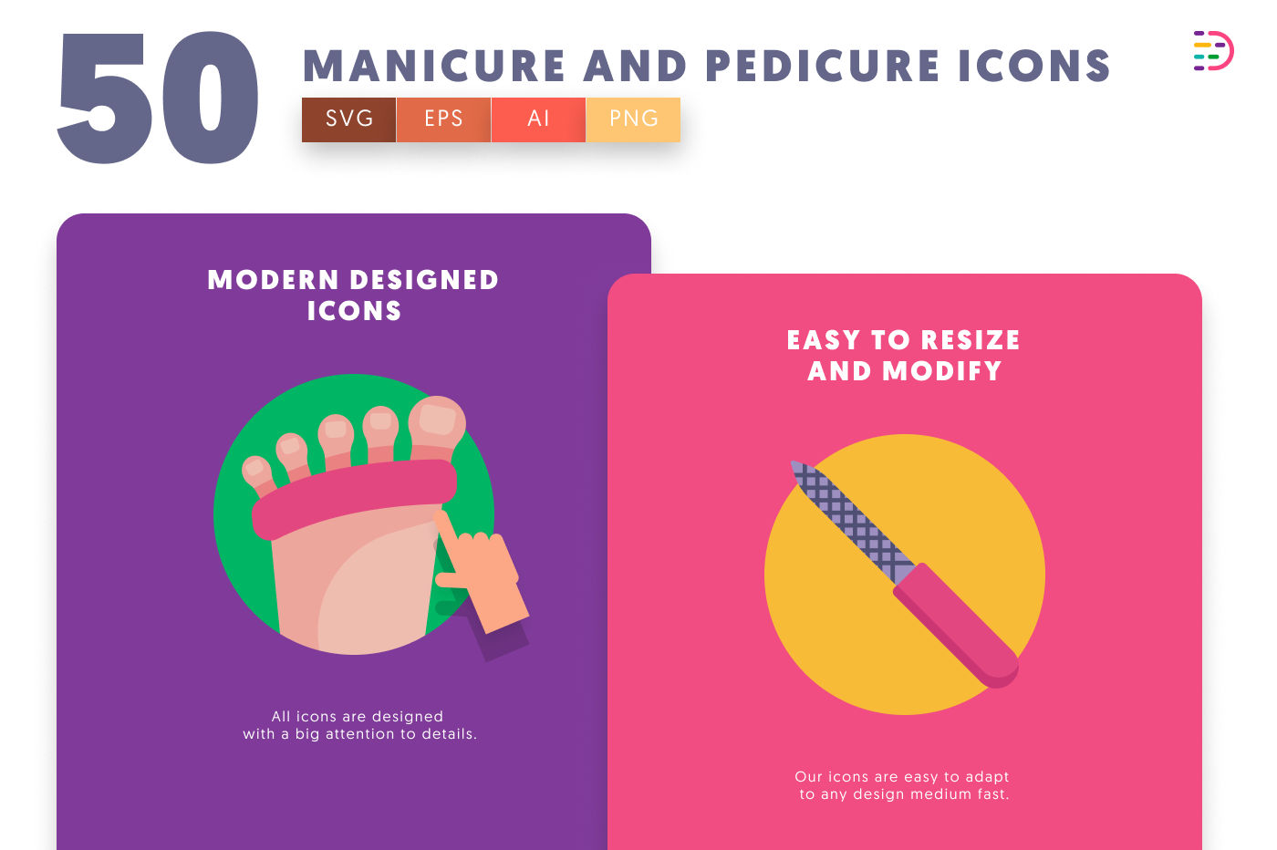 Elevate your beauty and nail care projects with the 50-Manicure and Pedicure Icons set. This versatile collection features sleek, modern icons representing nail polish, nail tools, foot care, and spa treatments. Perfect for websites, apps, social media, and print designs, these icons will help you create visually appealing content that attracts attention and enhances your brand. Ideal for beauty salons, nail artists, and wellness professionals looking to add a professional touch to their projects.