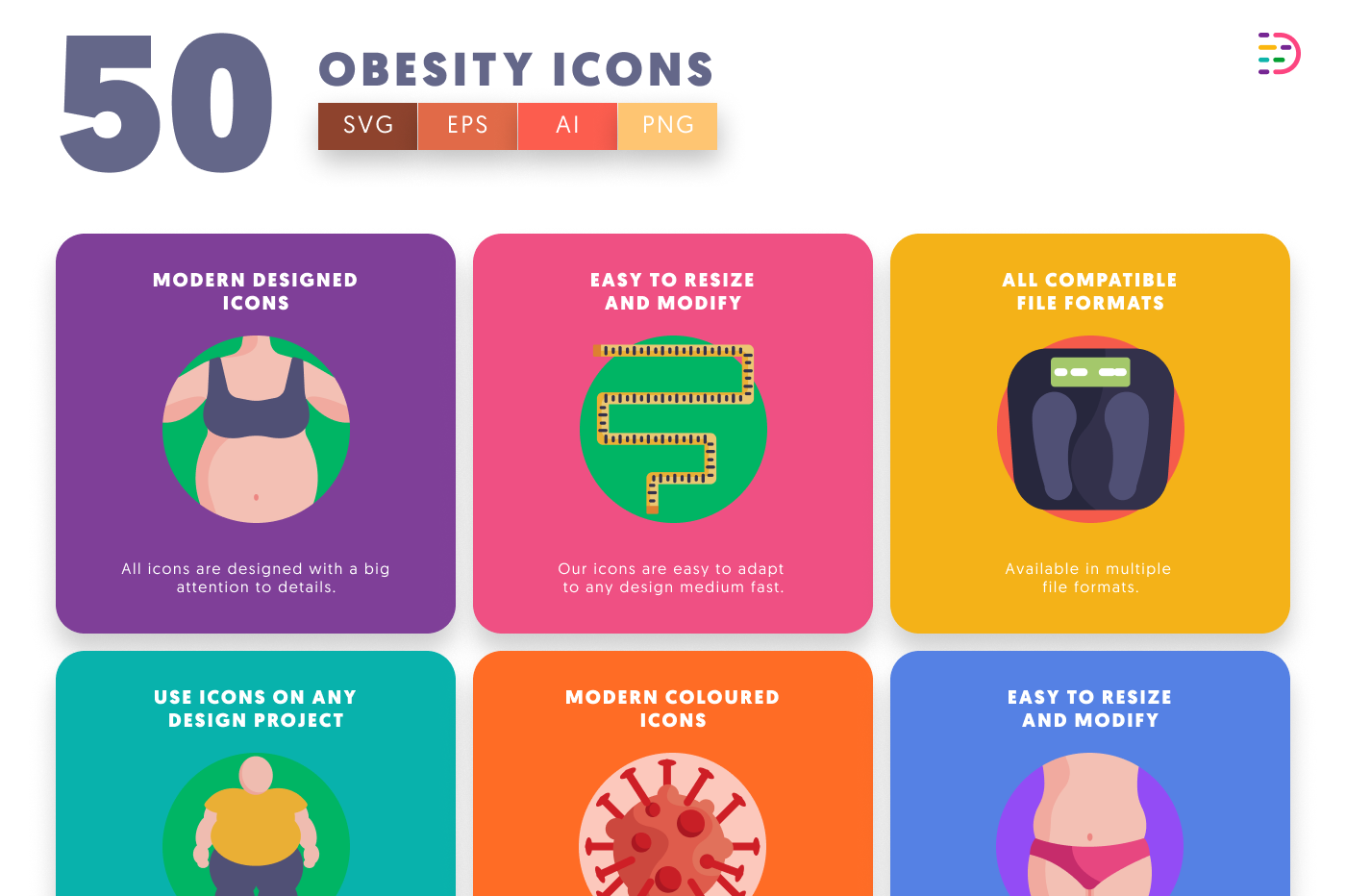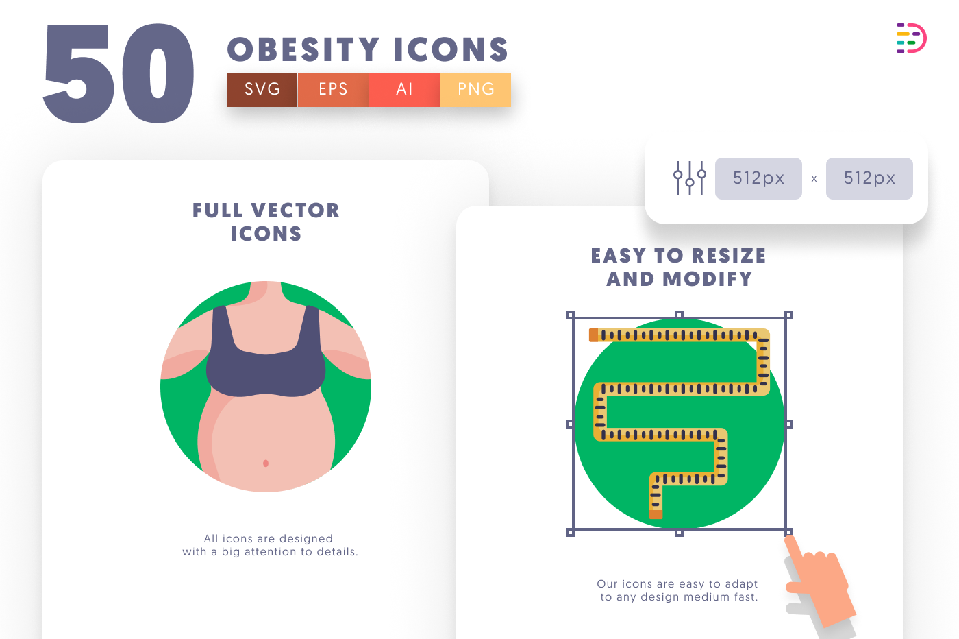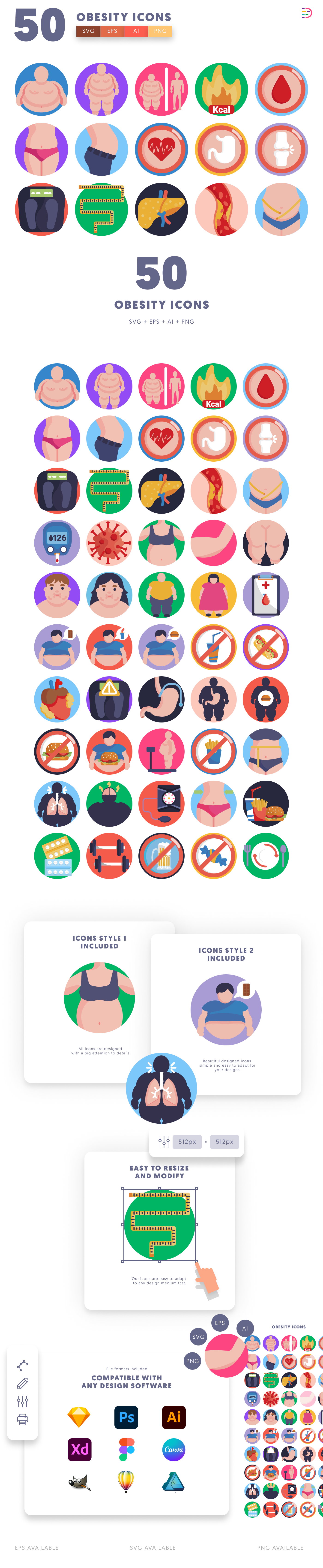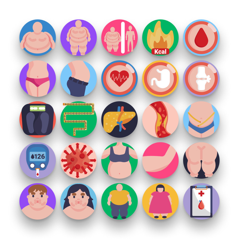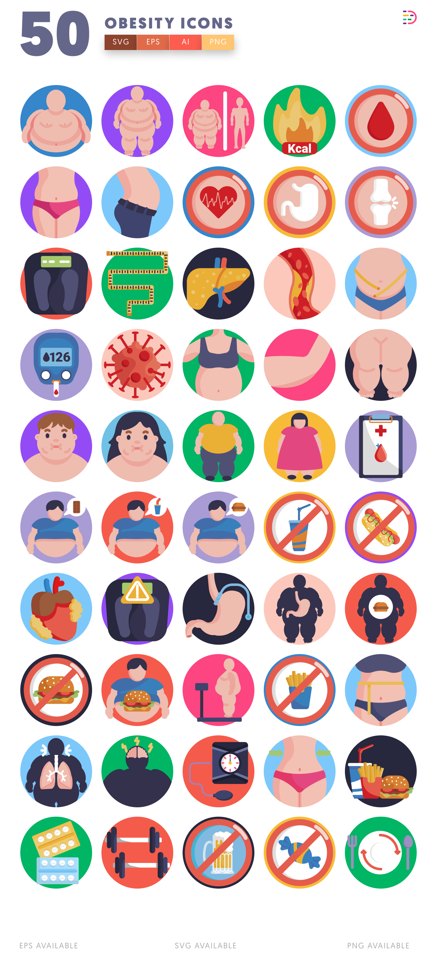 Enhance your medical, fitness, and wellness designs with the 50 Obesity Icons set. This professionally designed collection illustrates key concepts related to obesity, nutrition, exercise, and healthcare. Ideal for use in apps, websites, infographics, and educational materials, these vector icons are clean, modern, and easy to customize. Perfect for health professionals, designers, and educators aiming to promote awareness and understanding of obesity and its impacts.