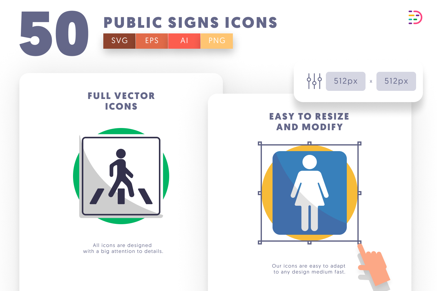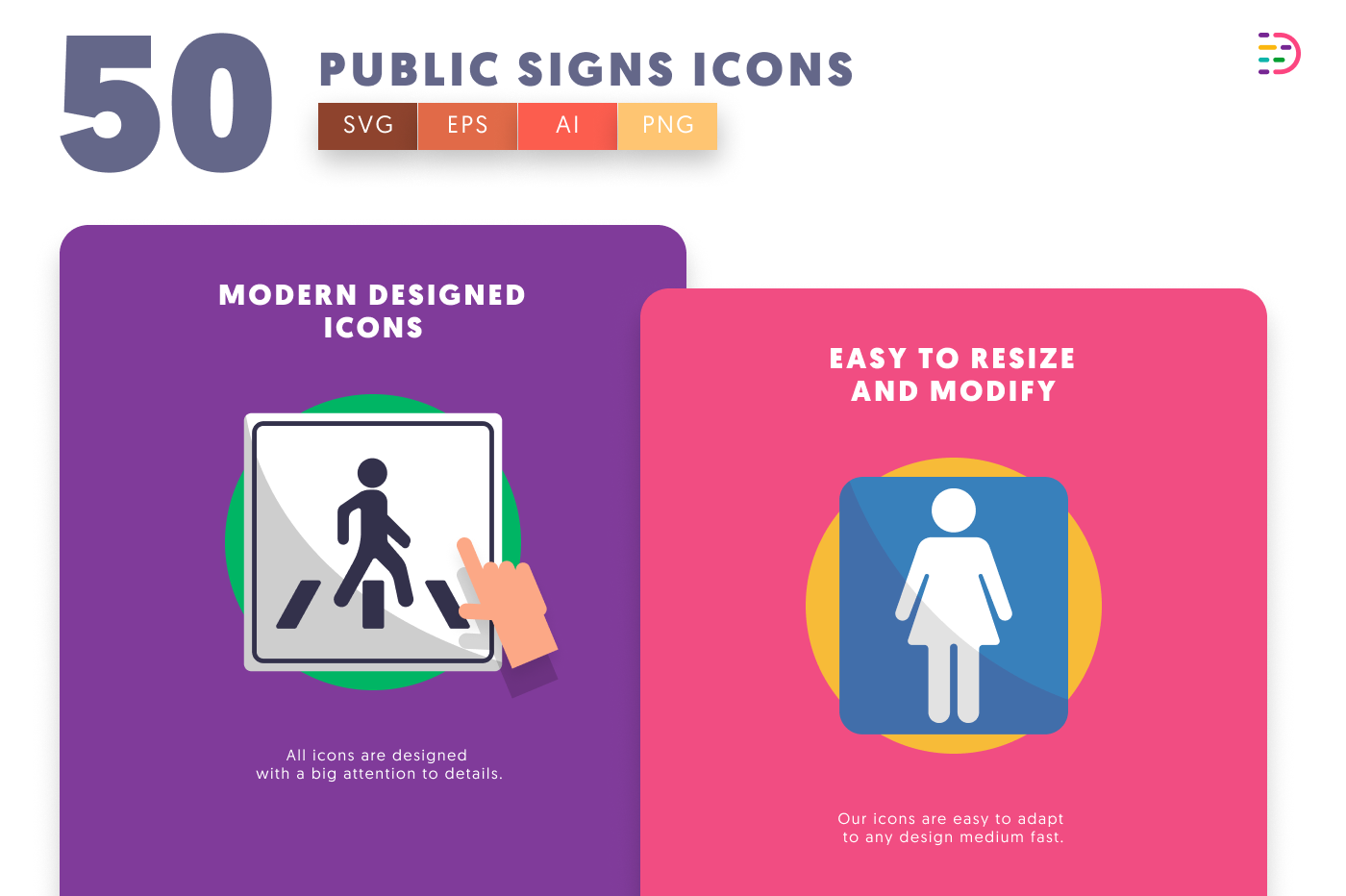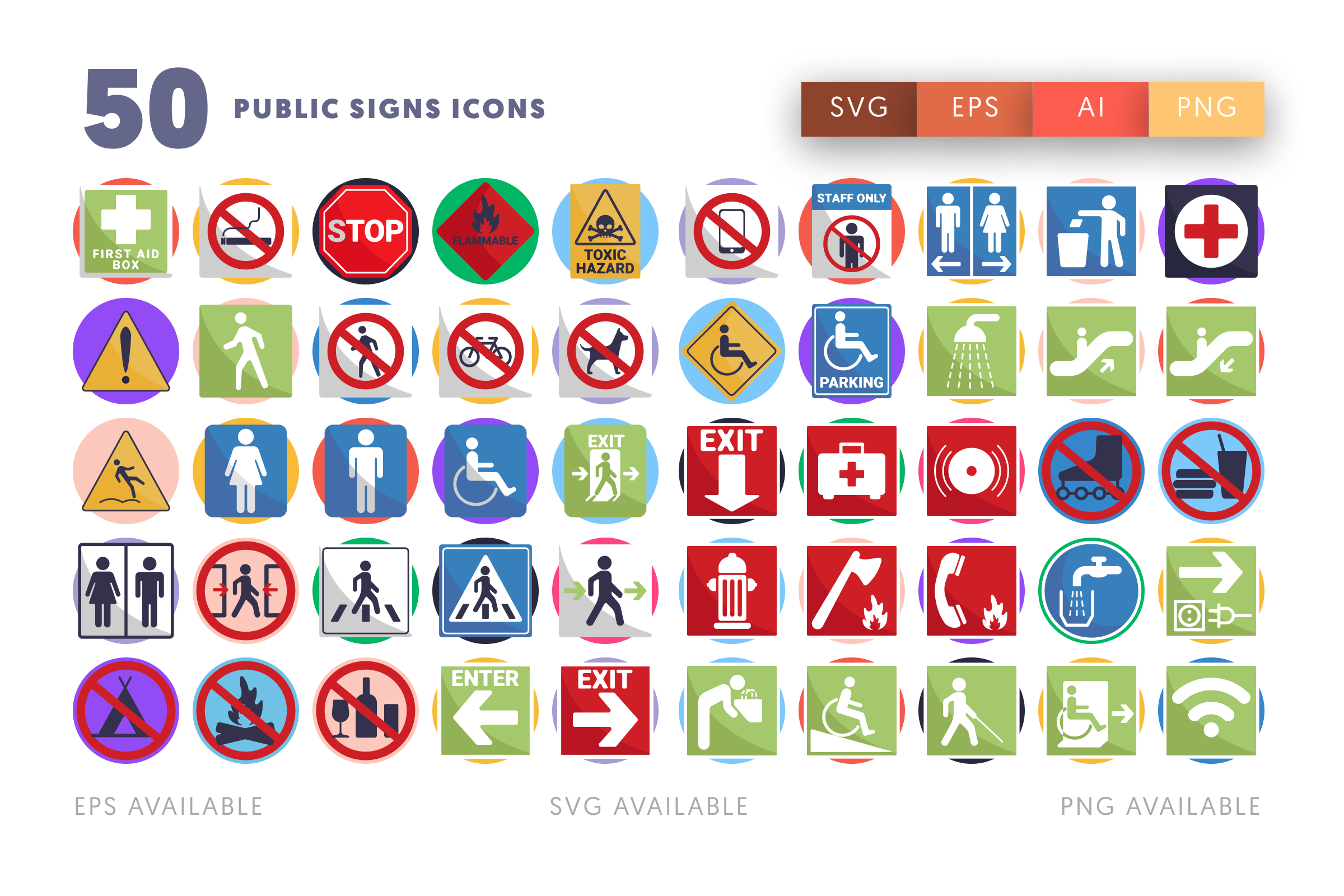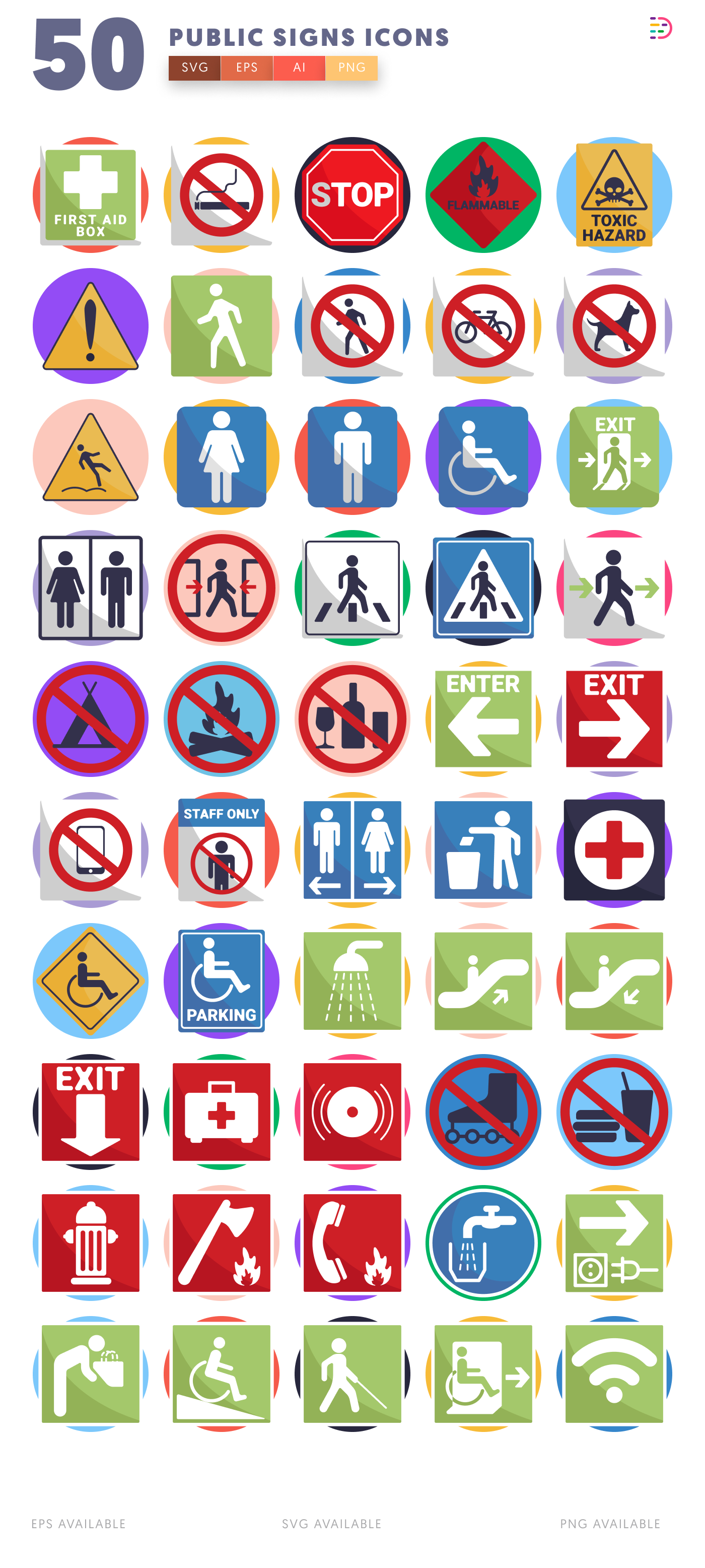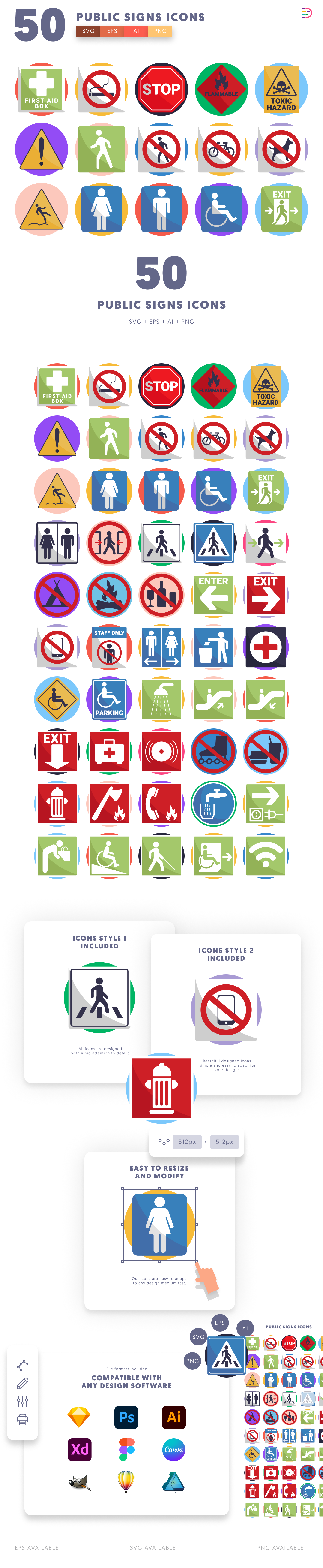 The 50 Public Signs Icons Set is a versatile collection of clear, modern icons designed for wayfinding, public spaces, and digital interfaces. Perfect for UI/UX designers, web developers, and graphic designers, this icon pack includes universally recognizable symbols such as restrooms, exits, parking, transportation, accessibility, and safety signs.