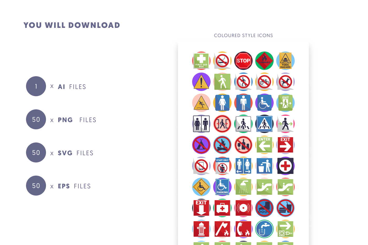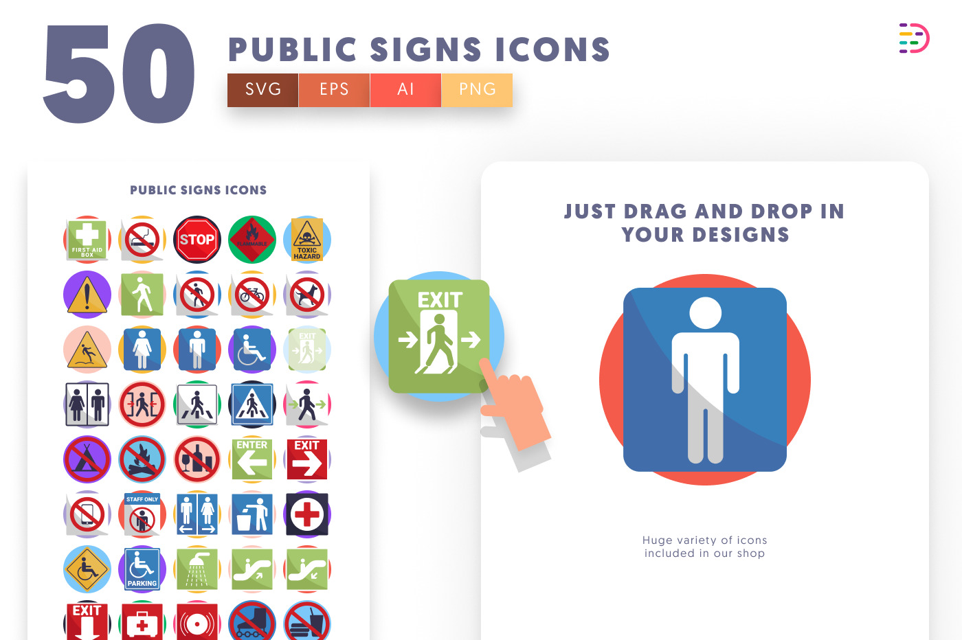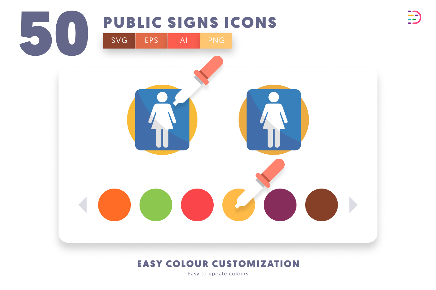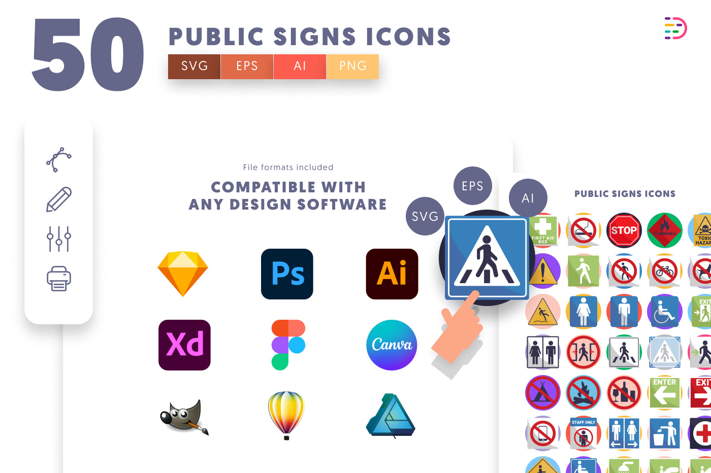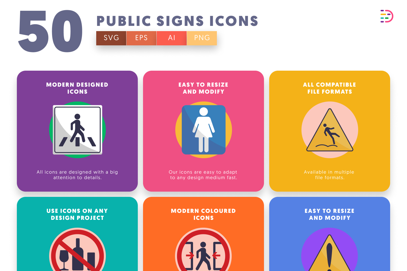 The 50 Public Signs Icons Set is a versatile collection of clear, modern icons designed for wayfinding, public spaces, and digital interfaces. Perfect for UI/UX designers, web developers, and graphic designers, this icon pack includes universally recognizable symbols such as restrooms, exits, parking, transportation, accessibility, and safety signs.